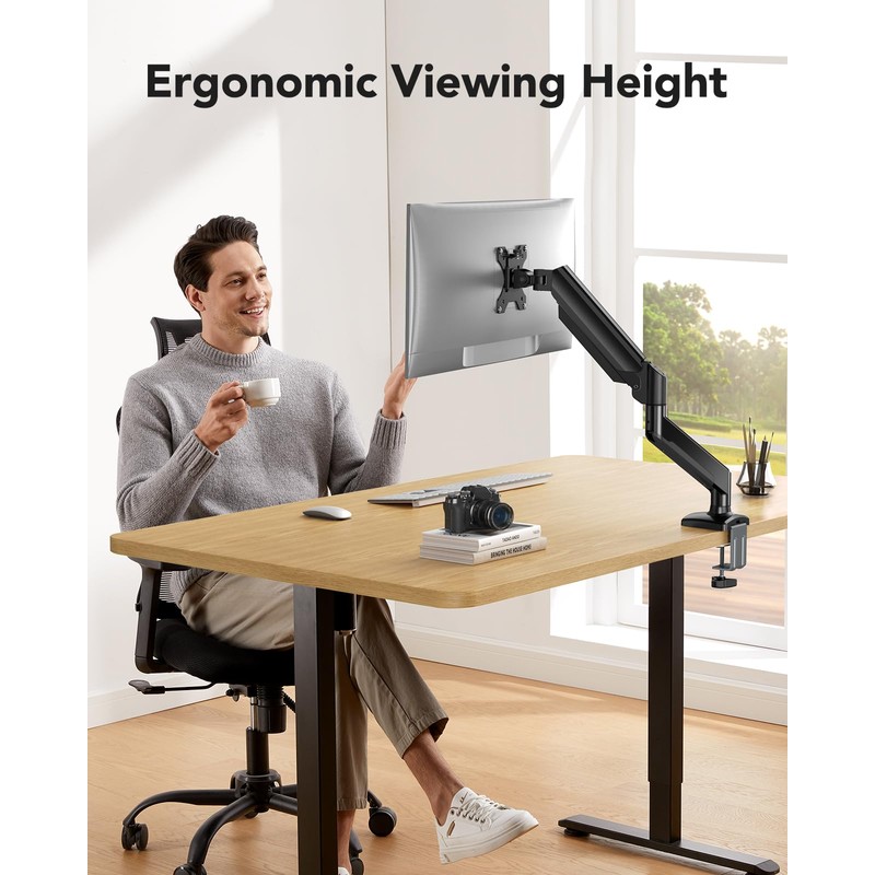 - Ergonomic Viewing Comfort: Our single monitor stand allows you to extend your screen out by 15.35″ and raise the arm up to 17.52″ above the desktop by adjusting gas springcore tension. This dynamic adjustment makes it possible to position your screen closer to eye level for more comfort and less neck and back strain
