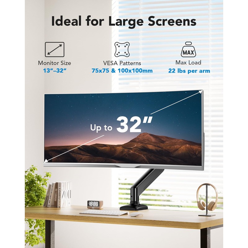 - Fits Large 32″ Screens: The computer single monitor stand is compatible with most 13″–32″ flat or curved screens with VESA mounting patterns 75x75 or 100x100mm. The wide size range allows you to mount most monitors above the desktop to free up valuable desktop space
