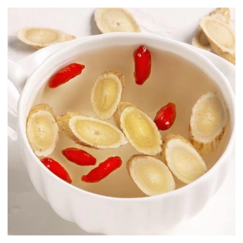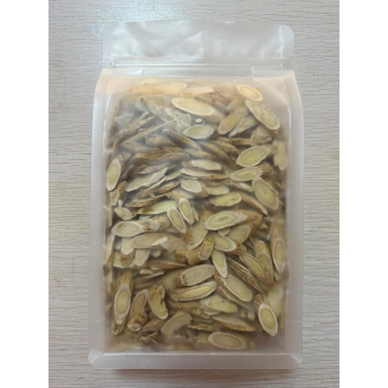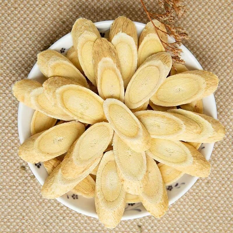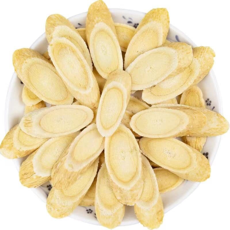 - Selected old roots of Astragalus membranaceus, sliced, baked at low temperature, with a strong bean aroma.