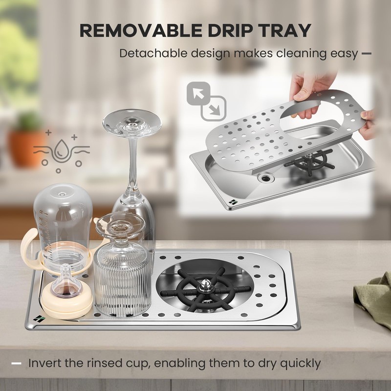 - [Removable drip tray] Equipped with a detachable drip tray, this feature of Huanyu bar cup washer makes water draining effortless. Its easy-to-detach design eliminates hygiene concerns, leaving your setup pristine and dry