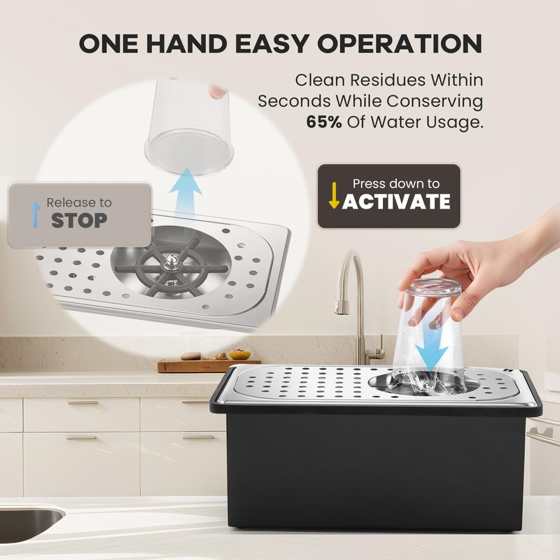 - [Easy and efficient operation] Simply press your cup down to activate the water flow and release to stop—it’s that easy! Clean residues within seconds while conserving water. Perfect for winter use, the glass rinser for bar keeps your hands from freezing during cleaning