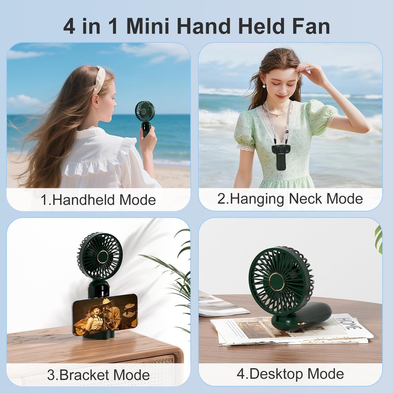 - [3 in 1 Multi-function fan] The protable fan can be used as a handheld fan, neck fan or desktop fan for a wide range of applications. Our foldable fan comes with a base so you can place it vertically on a table and use it as a desk fan. With 90°vertical adjustment, you can easily fold it and hang it around your neck as a neck fan, freeing your hands