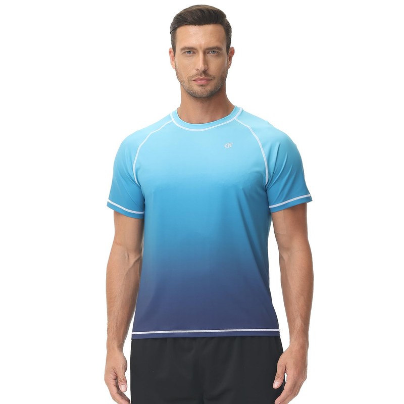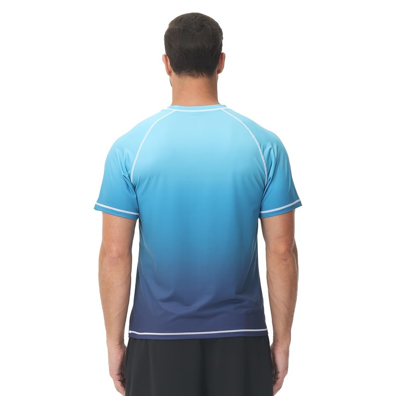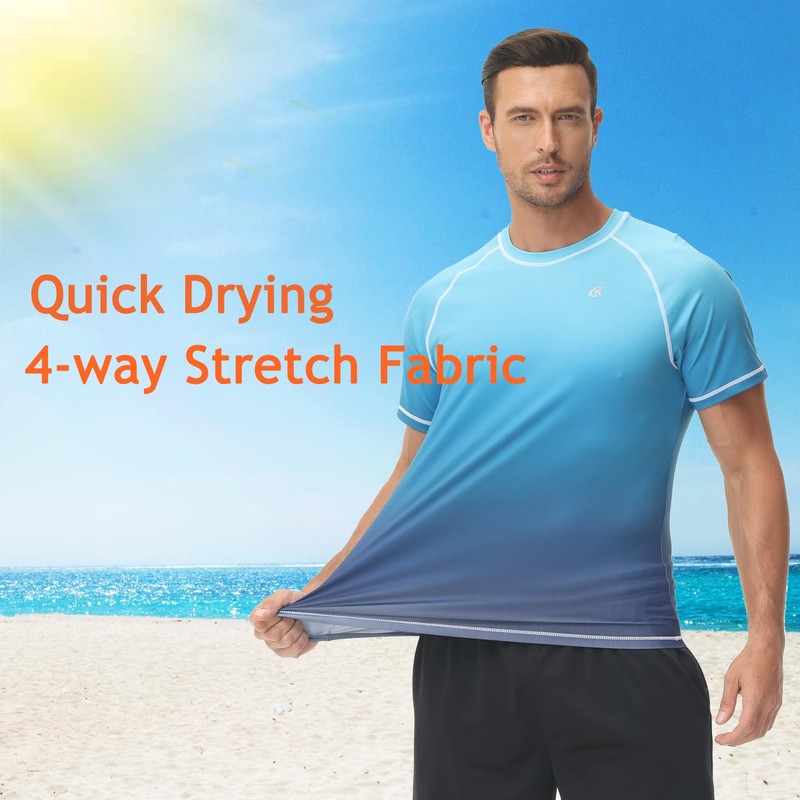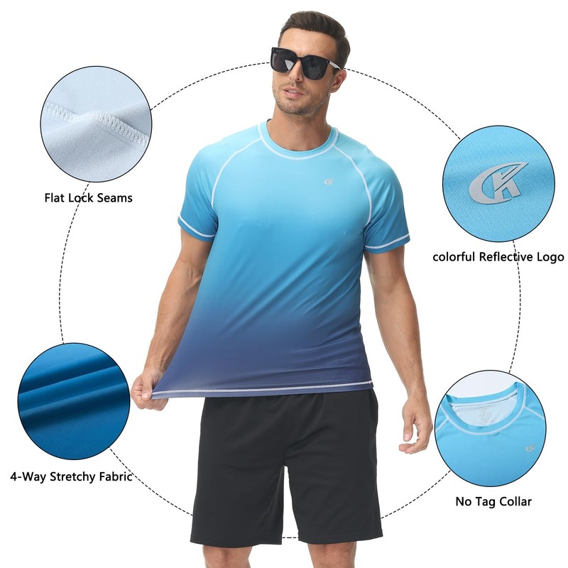 - 【Relax Fit】Four-way stretch technology makes the swim top more flexible and comfortable. Mens rash guards with a classic round collar design, gradient color design,flatlock seams and tagless collar reduce friction and increase comfort.