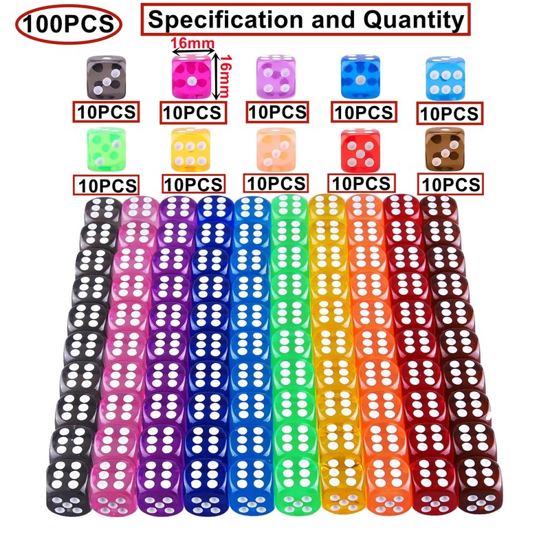 - Size: Tandard 16 mm (5 / 8 cm) game dice, square corner made of environmentally friendly acrylic material.