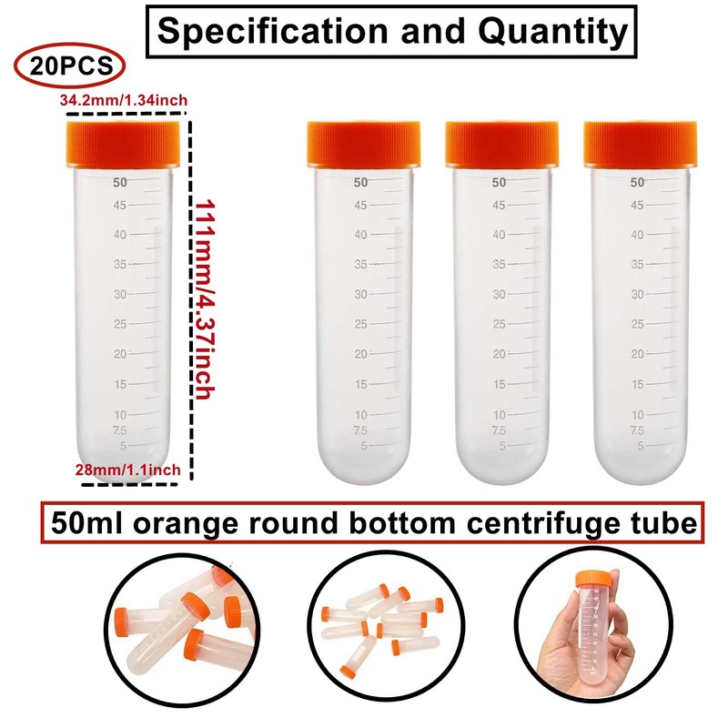 - Package includes: 20 x 50 ml round base plastic laboratory centrifuge tubes.