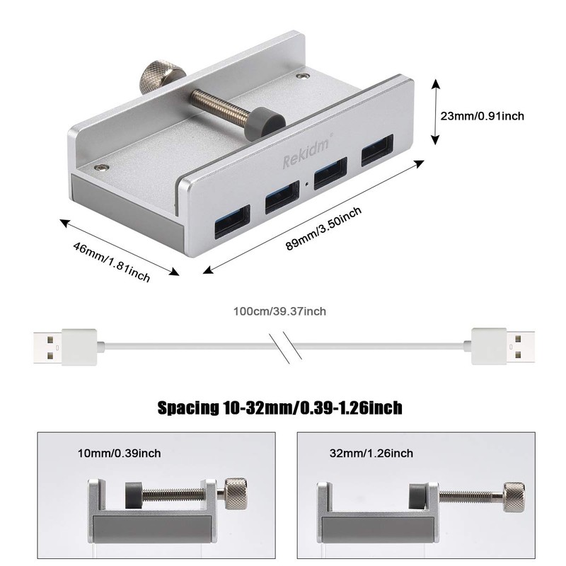 Hub USB 3.0 - Rekidm 4 puertos de aluminio de computadora USB Hub 3.0 con abrazadera de diseño para computadora, computadora, PC, borde de mesa con clip ajustable duradero, Hub USB montable,