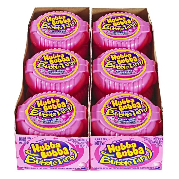 Hubba Bubba offers great tasting bubblegum with outrageous flavors and exciting product forms including Hubba Bubba Max and Hubba Bubba Bubble Tape. Hubba Bubba gum has become a well-recognized brand across the globe in countries such as Canada, U.S., Australia, Germany and the U.K. Awesome Original, 6 Feet of Bubble Tape Bubblegum. Each Roll Contains 6 Feet of Gum (56 g). Total of 12 Rolls per Box. Imported from Canada