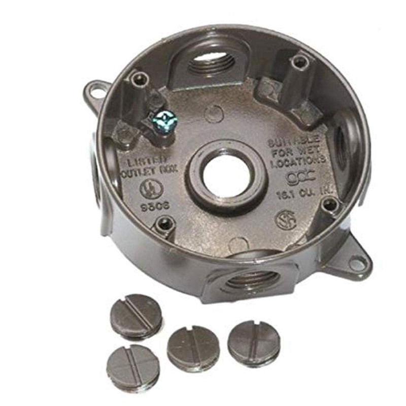 The Raco 4-inch Round Bronze Splice Box with Five Threaded Outlets is designed for use in branch circuit wiring in wet, damp, or dry locations. The box can be used as a weatherproof junction box and may be used with Bell round cluster covers and round lampholder combinations. Featuring rugged, die-cast construction, the box has five threaded, reinforced 1/2-inch connector outlets and a state-of-the-art powder coat finish that provides maximum weatherability and scratch resistance. Cast-in mounting lugs provide fast, secure installation, and the box also includes four closure plugs, an installed ground screw, and helpful instructions, so you have everything you need. Raco's high-quality splice boxes and accessories are designed with careful attention to the national electric code, so you can be sure that your electrical system is safely, efficiently wired.