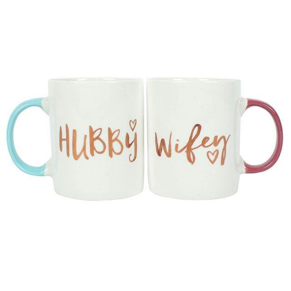 - A pair of fun mugs featuring the words Hubby and Wifey in gold