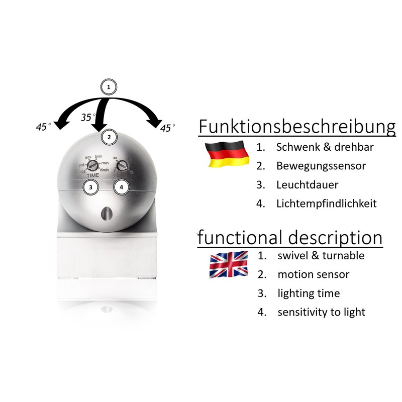 - Motion sensor - The sensor reacts reliably to movements at an angle of 180° thanks to infrared technology. The detection range of the motion sensor is up to 12 m. The switch-on time can be set between 10s and 15min.