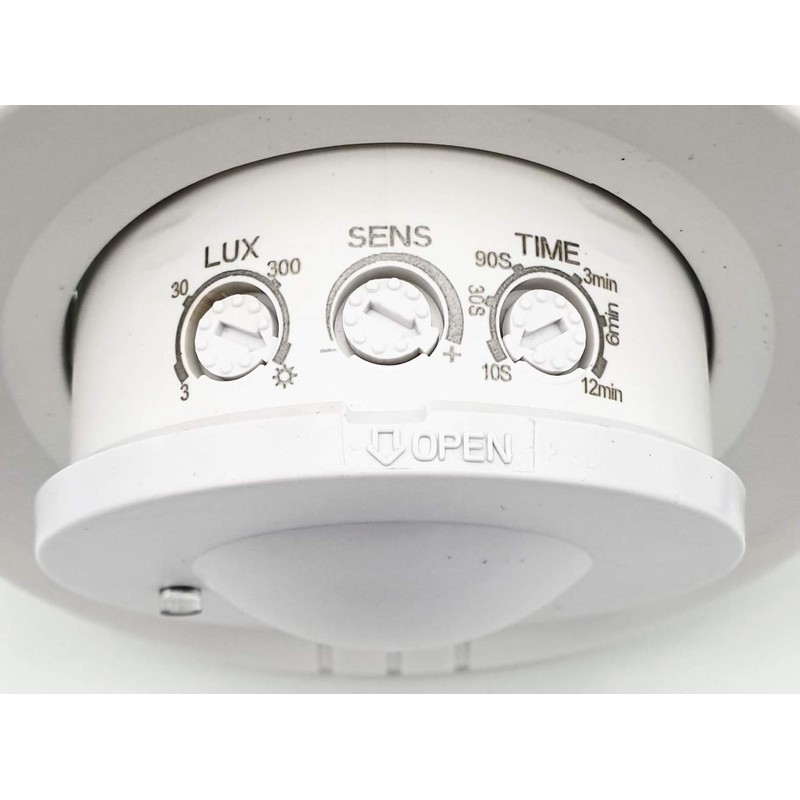 - Motion sensor - The sensor reacts to movements at an angle of 360° thanks to radar technology. The detection range of the motion sensor is adjustable up to 8 m radius. The switch-on time can be set between 10s and 12min.