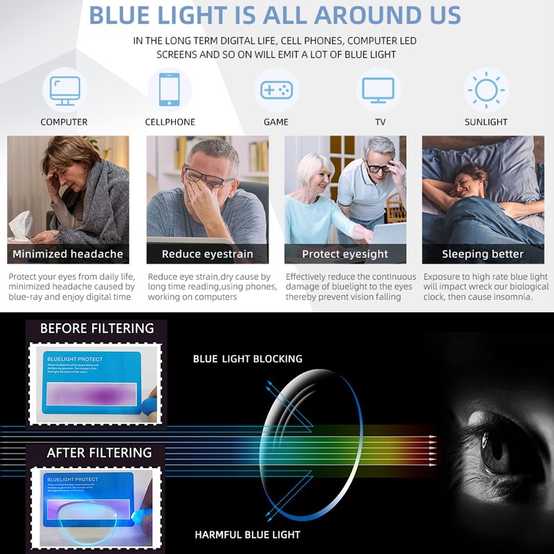 - 💎【Blue Light Glasses】Block blue light and UV400 damage and protect your eyes. When you use digital products (mobile phone/computer/TV/...), these glasses can play a good role in relieving eye fatigue, dryness, vision loss, etc., and improving sleep.