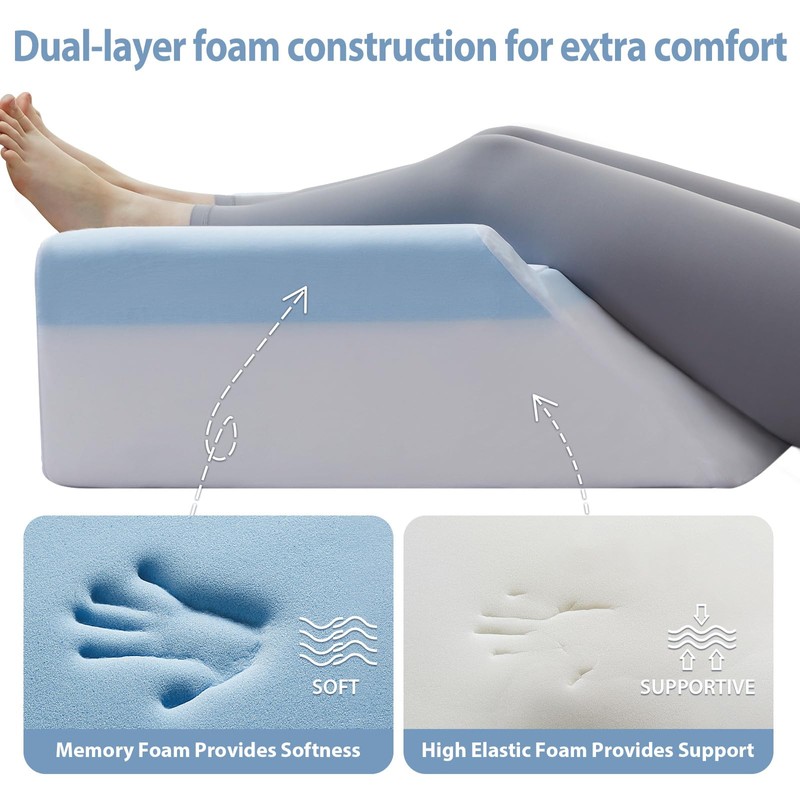 - Soft but supportive leg elevation pillow : The top layer of the leg pillow is made of gel memory foam for softness and comfort. The bottom layer of the knee pillow is made of high-density foam, which provides effective support without deformation over time