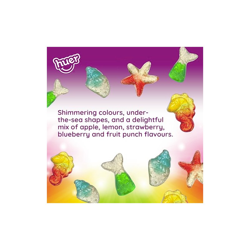 OCEAN INSPIRED GUMMIES a glittery underwater adventure packed into every pouch, filled with sea creature shapes, bright fruity flavours, and an irresistible sparkle. UPLIFT THE MOMENT Unique candy experiences make for fun, flavourful memories! CONVENIENT SNACK PACKS 60-gram bags are perfect for your pocket, purse, school lunches, or an afternoon treat! HAPPY STARTS HERE Take a bite of happiness with Huer gummies.