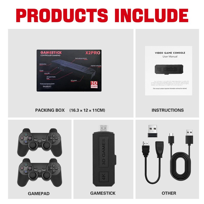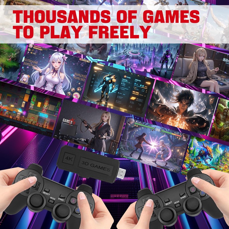 - 【 Convenient plug and play 】 Simply connect the game stick to a power source, plug it into the HDMI port of the TV, switch the TV to high-definition channels, and the game menu will appear on the screen. Insert two 2.4g wireless controllers and assemble 2 AAA batteries for each controller (not included). So, you are ready to assemble it and enjoy the fun.