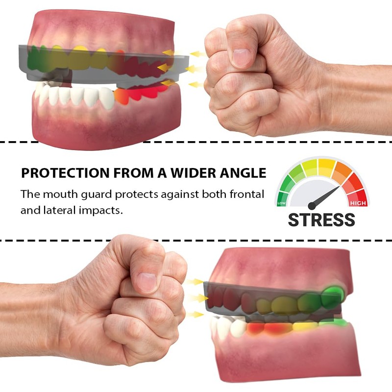 - Maximum Impact Dispersion: SG's original mouth guard construction maximizes the dispersion of impact forces from all angles, whether from the front or the side