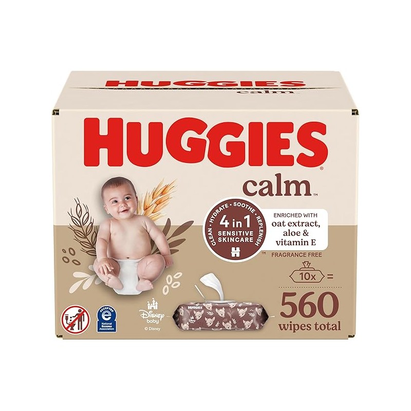 Huggies Calm Baby Wipes, Unscented, Hypoallergenic, 10 Push Button Packs (560 Wipes Total)
