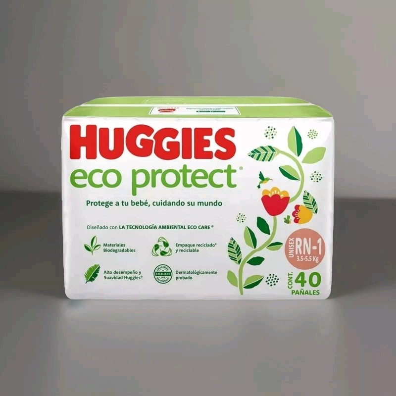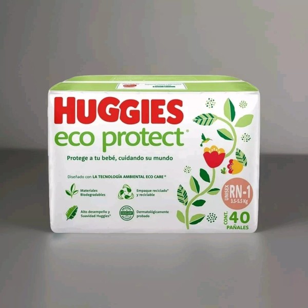 Product details Designed with environmental technology Eco Care: we redesign the process production to reduce consumption resources and energy Recycled and recyclable packaging • High performance and softness Huggies Fragrance free Dermatologically tested Huggies Eco Protect designed with technology environmental Eco Care We redesign the production process to reduce resource and energy consumption Diaper that returns to nature in less than 3 years Packaging is made with recycled materials and recyclable Diaper with high performance and softness Huggies, free fragrance-free and dermatologically tested Newborn stage-one ideal for babies 3 to 5.5 kg
