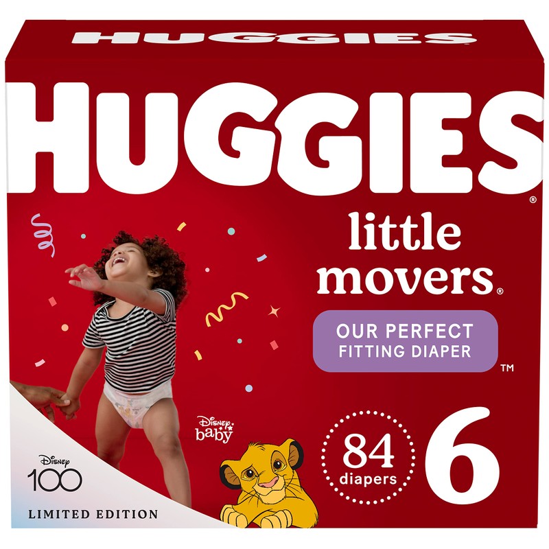 • 84 Huggies Little Movers Baby Diapers, size 6 (35+ lbs); the only diaper brand to feature Disney's The Lion King designs; packaging may vary