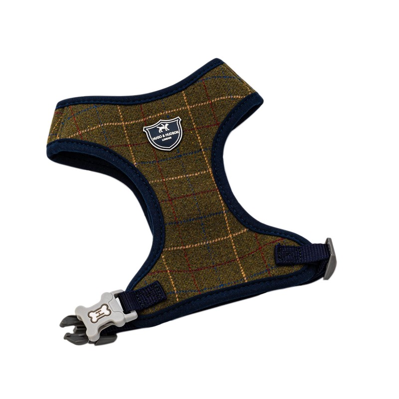 HUGO & HUDSON Tweed Dog Harness No Pull Adjustable Rear Buckle Vest, Dark Green Checked, XS