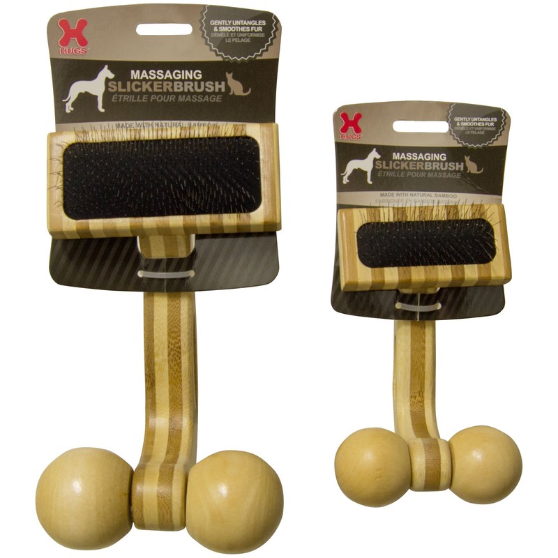 Make sure your pet doesn't look scruffy thanks to the Hugs Bamboo Massaging Slicker Brush that gently untangles and smooths fur. Your pet will stay calm and relaxed as the two massaging balls attached to the brush gently massage your pet as you brush their coat. Designed with the professional pet groomer and pet parent in mind, this brush is made with natural bamboo and will have Fido thinking he's spending a day at the spa.