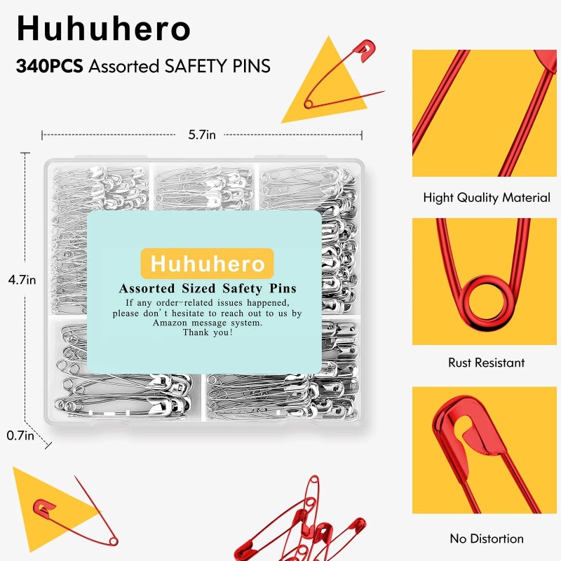 Huhuhero Safety Pins Assorted, 340-Pack 5 Different Sizes Large Safety Pins Heavy Duty