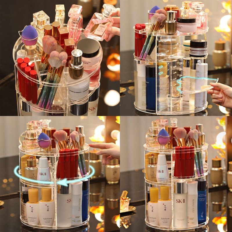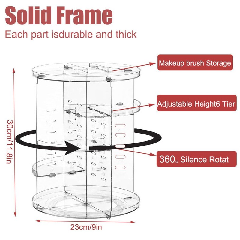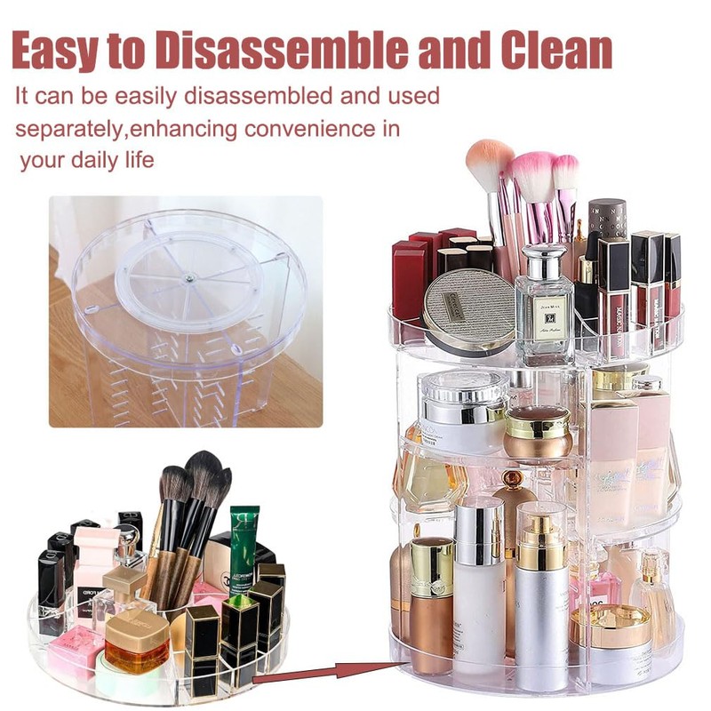 - 【360° Rotation】The 360-degree rotating clear makeup organiser is designed with a reinforced base that rotates smoothly and silently, allowing you to organize and find the cosmetics. And the edge on the tray is high enough to prevent makeup from falling during rotation.