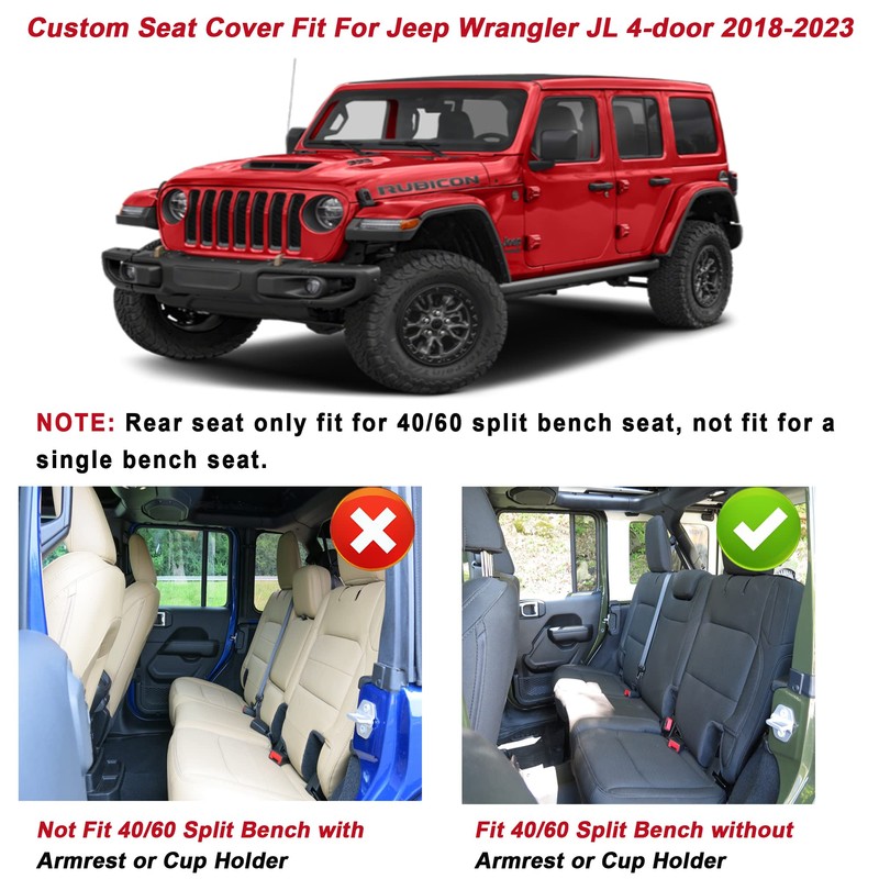 - ►【Custom Fit】Precisely measured and tailored, the front and rear full set seat covers compatible with Jeep Wrangler JL 4-door 2018-2024 without rear cupholder. WARM NOTE: This item is ONLY FIT for Wrangler 4-Door which rear seat is 40/60 split seat and without rear cupholder, Not Fit for Wrangler 2-Door, Not Fit for Wrangler 4-Door which rear seat is a full bench seat and with rear cupholder, as shown in Figure 6. Please choose the right size for your truck