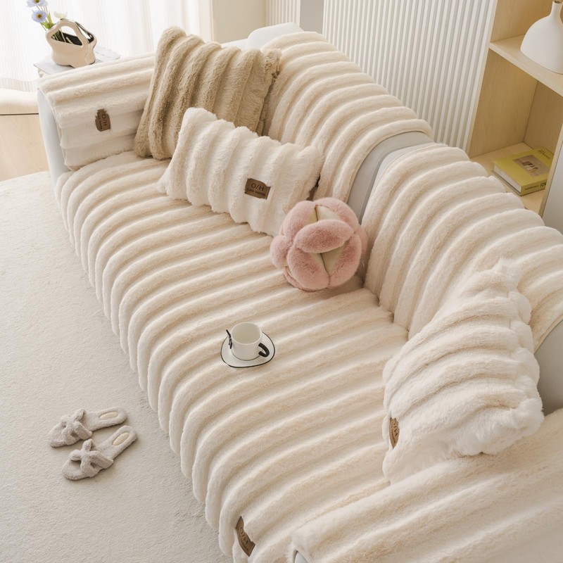 Huierxun Fuzzy Rabbit Plush Sofa Cover Thick Soft Fur Sectional Couch Cover Furry Fluffy Cushion Cover Non-Slip Sofa Slipcovers Vertical Stripe Furniture Protector for Dogs Cats(Cream,43"x94")