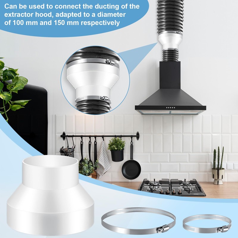 - Flexibler Einsatz: Der Abgasschlauchkonverter kann leicht zwischen 150mm und 100mm Rohrdurchmesser wechseln und löst damit perfekt das Problem der Verbindung verschiedener Rohrdurchmesser, geeignet für alle Arten von Lüftungs- und Klimaanlagen
