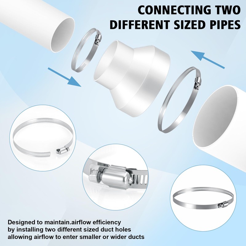 - Hochwertige Materialien: Die Reduzierstücke von 150 mm auf 100 mm für Lüftungskanäle sind aus hochwertigem, starrem Kunststoff gefertigt und daher sehr langlebig. Die vier Schellen sind aus rostfreiem Stahl 304 gefertigt. Sie sind rostfrei, stark und sicher