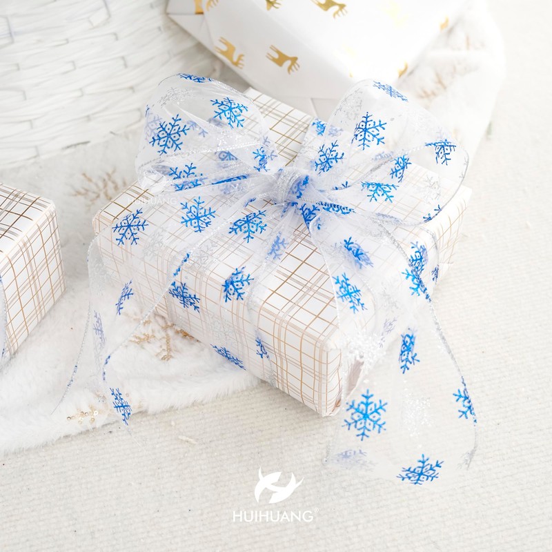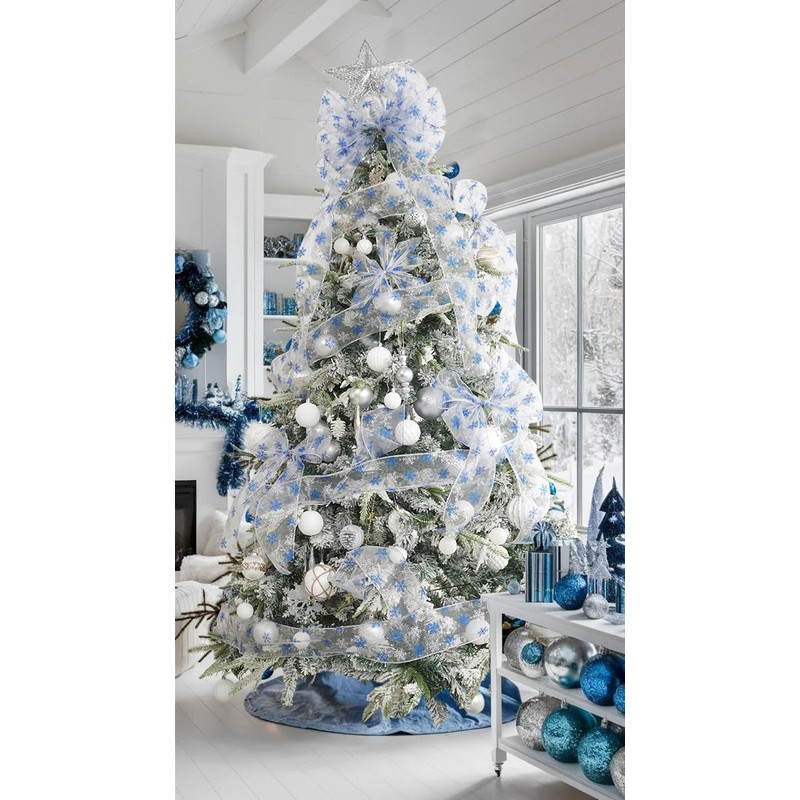 - Pattern Designs: This ribbon with glitter blue and silver snowflakes print on white organza sheer wired ribbon, the silver blue and white colors with snowflakes design creating a winter wonderland theme for Christmas