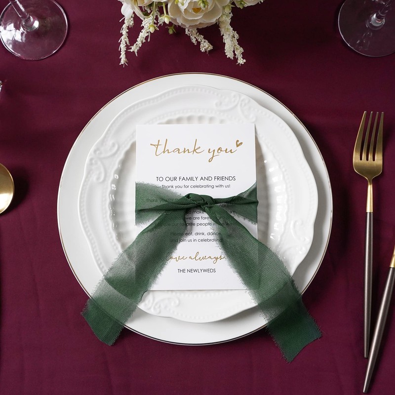 - Set Package: 50pcs Elegant Table Place Setting Thank You Cards and 50 Pcs Moss Green Chiffon Ribbons.