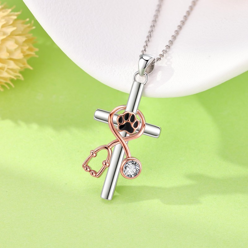 HUKKUN Vet Tech Gift Sterling Silver Paw Print Stethoscope Cross Necklace Veterinarian Appreciation Jewelry Gift for Women