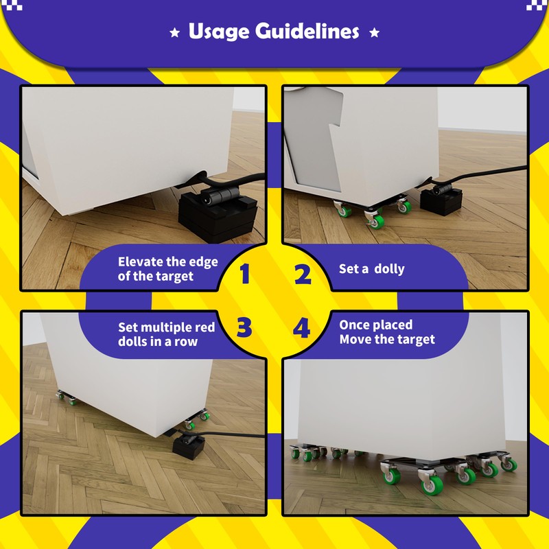 1. Use a crowbar to lift the feet of the furniture, the maximum lifting height is 4.8 in. 2. Place the slider on the bottom of the furniture. There is a raised baffle on the edge of the sliding block, can firmly fix the furniture. 3. Repeat the above steps until all 4 feet of the furniture are placed in the slider. 4. Move the furniture to the desired location. Features of furniture dolly movers