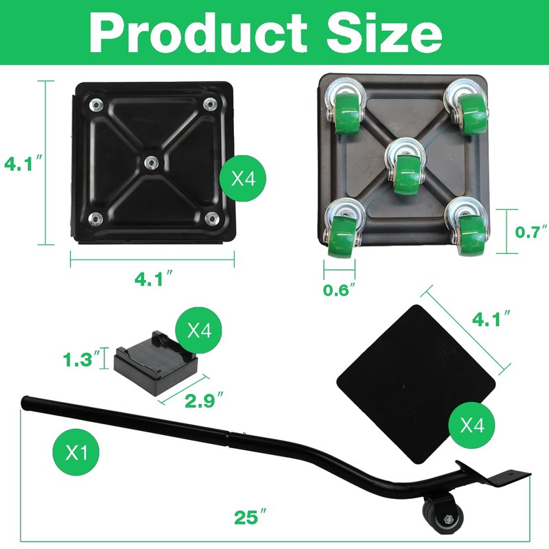 Length of crowbar: 24.5in/62cm Slider size:4.1in * 4.1in * 1.2in Maximum elevation height: 4.8in/12cm Maximum load: 1650Ib Packing list: Extendable lifting arm x 1, Square slider x 4, Heightening blocks x 4, Non-slip mats x 4, A pair of gloves How to use furniture rollers and lifter