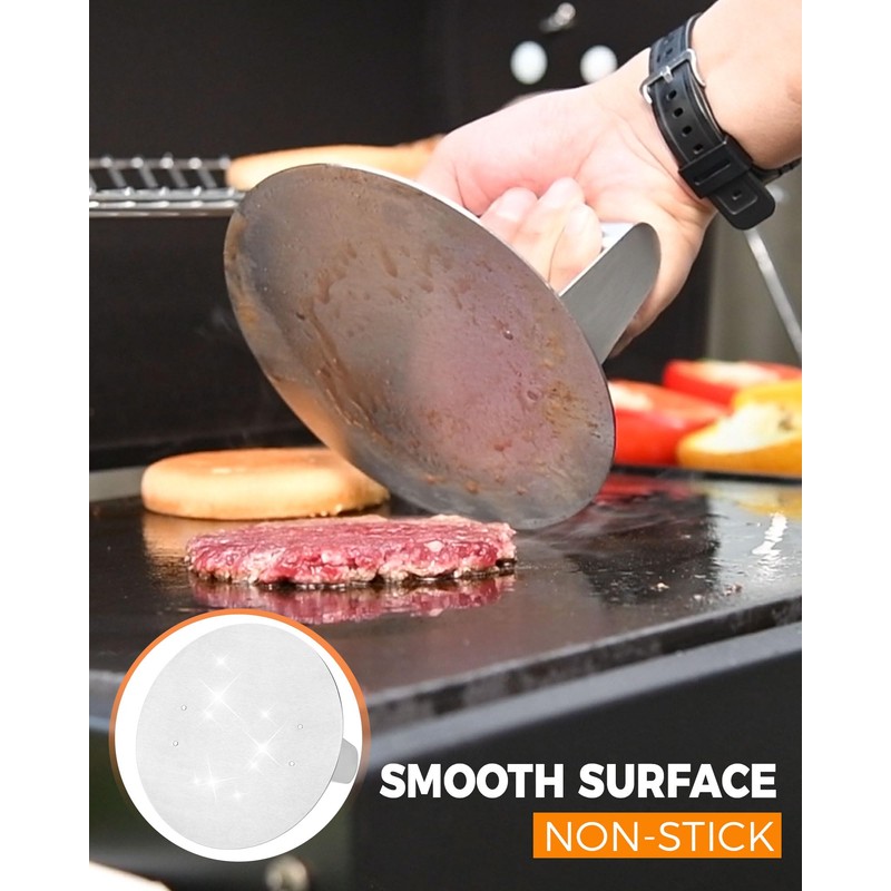- Reduce Cooking Time & Increase Flavor: Even heating with the stainless steel smashed burger press ensures each burger patty achieves optimal searing, enhancing the flavor. Get smashed burgers at home, anytime!