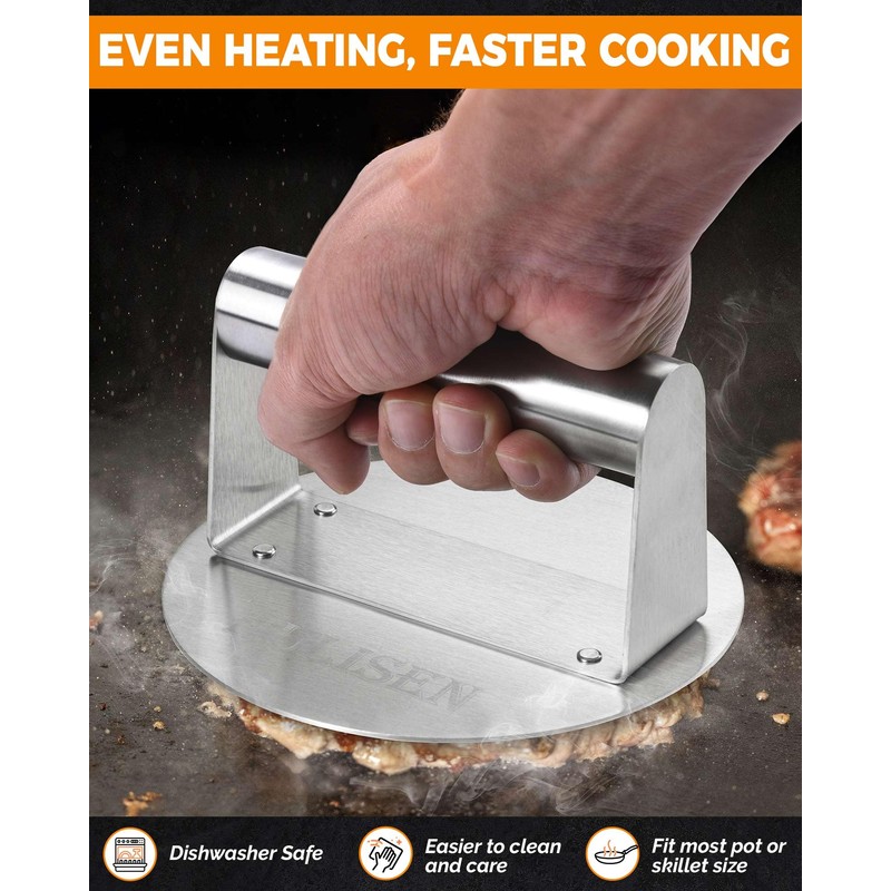 - Easy to Clean and Maintain: HULISEN burger smasher for griddle is made from stainless steel, low-maintenance, and dishwasher-friendly, and does not require excessive maintenance and caretaking like a cast-iron grill press. After smashing your burgers to perfection, cleanup is a breeze! The round grip handle is made with laser welding technology to maintain the grip’s firmness. You can even use the press for flipping and smashing burgers, cheese, bread, paninis, etc.