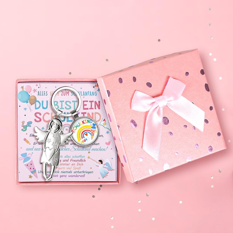 - Einschulung Geschenk für Mädchen: Schutzengel Schlüsselanhänger mit Grußkarte und rosa Geschenkbox. Machen Sie diesem besonderen Mädchen eine Freude und geben Sie ihm einen Schutzengel, der es auf seinem Schulweg begleitet.