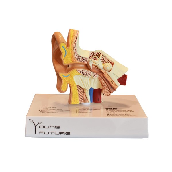 This model shows three main structural parts of the hearing organ (external ear, middle ear, internal ear) and the position of the equilibrium organ of human body.