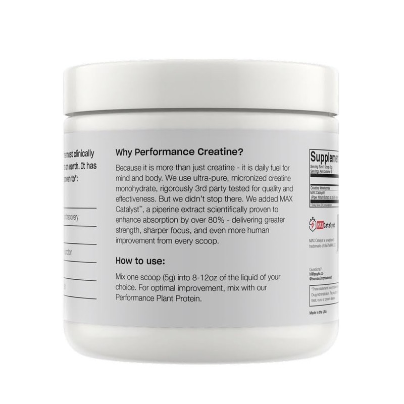 - ENHANCED ABSORPTION: Our Performance Creatine includes MAX Catalyst, a patented black pepper extract that helps your body absorb the creatine up to 80% better - so you get greater strength, sharper focus, and even more human improvement from every scoop.