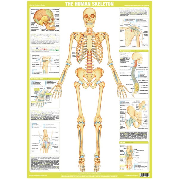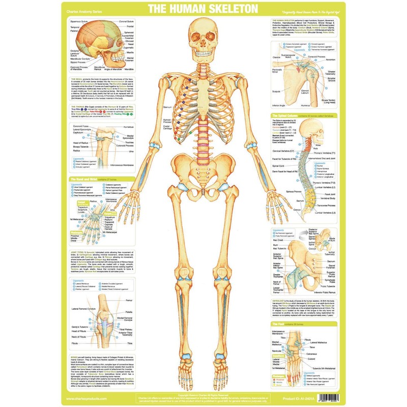 The Hand Drawn anatomical illustrations, originally commissioned by Chartex prior to the Digital Age, make this Skeleton Poster interesting and informative, providing a useful training aid and reference resource suitable for Hospitals, Medical Practices, Physiotherapists, Educational Establishments, Health Clinics, Gymnasiums or as decorative wall art.