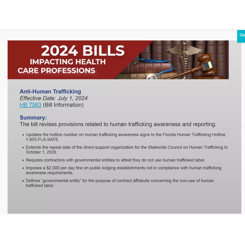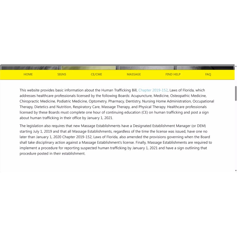 By January 1, 2021, healthcare professionals licensed by the Acupuncture, Medicine, Osteopathic Medicine, Chiropractic Medicine, Podiatric Medicine, Optometry, Pharmacy, Dentistry, Nursing Home Administration, Occupational Therapy, Dietetics and Nutrition, Respiratory Care, Massage Therapy, and Physical Therapy Boards must display the Florida Human Trafficking Poster. The poster must also be displayed in emergency rooms of general acute care hospitals, in strip clubs and other adult entertainment establishments, and in any business establishment that is not owned by a regulated health care practitioner and which offers massage or bodywork services for compensation. The poster must be at least 11″ x 15″ in size, and must be printed in English and Spanish. The text must be at least a 32-point type.