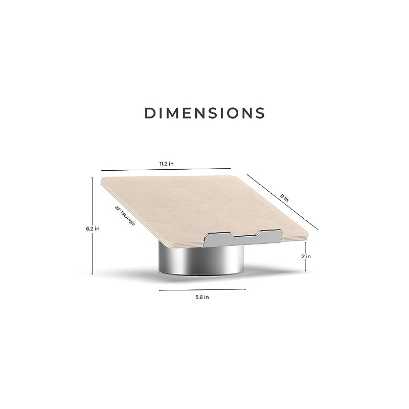 - Dimensions and specifications: 25 degree angle tilt, 5.6 inch metal base diameter. 11.2 inch width x 9 inch length top platform, 6.2 inch rear height, 2 inch front height. See product images for detailed dimension graphic.