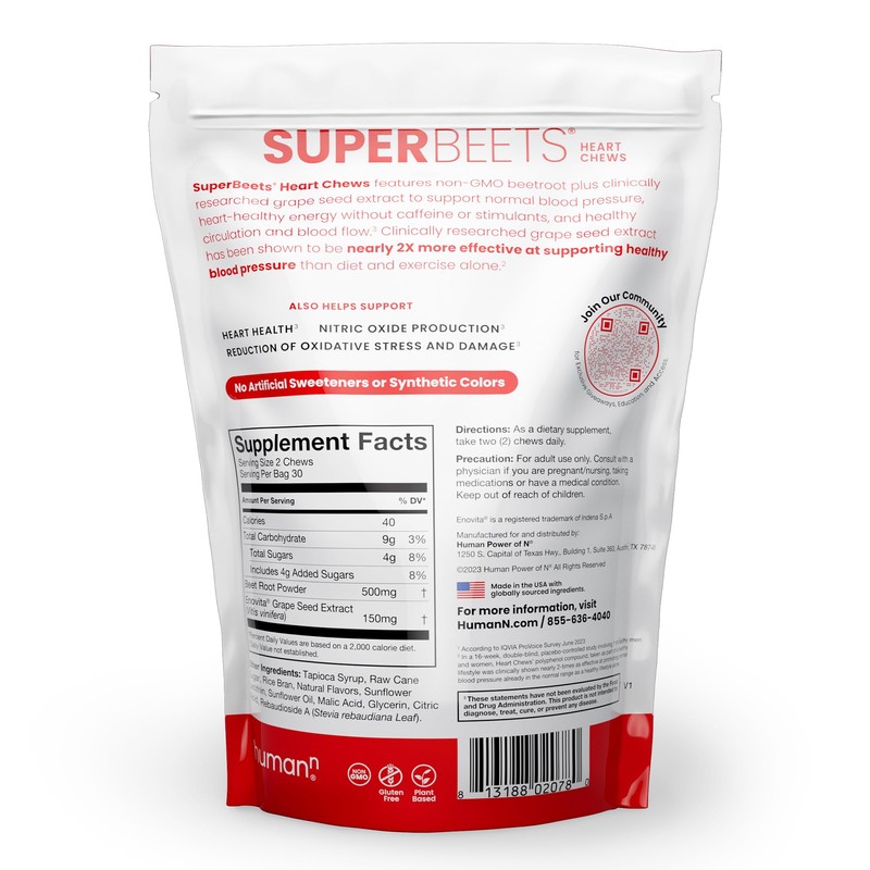 - SUPPORT BLOOD PRESSURE & ENERGY: SuperBeets Heart Chews are powered by clinically studied Grape Seed Extract to support healthy blood pressure. These Nitric Oxide supporting supplements for men and women may help support healthy circulation.