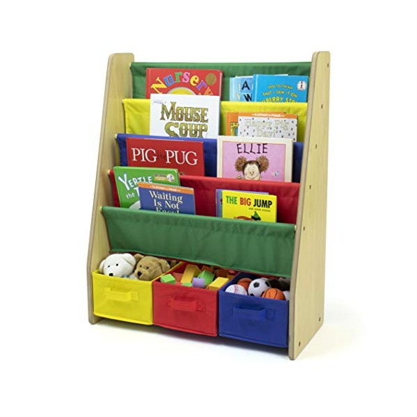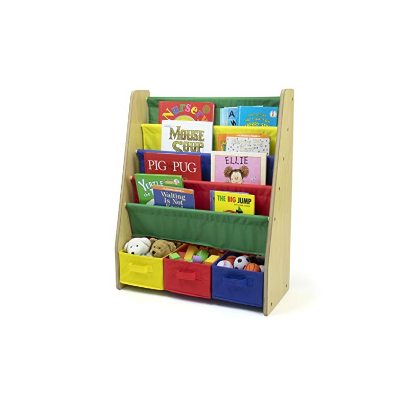 - Nylon fabric bins and shelves in primary colors paired with natural finish wood side panels.