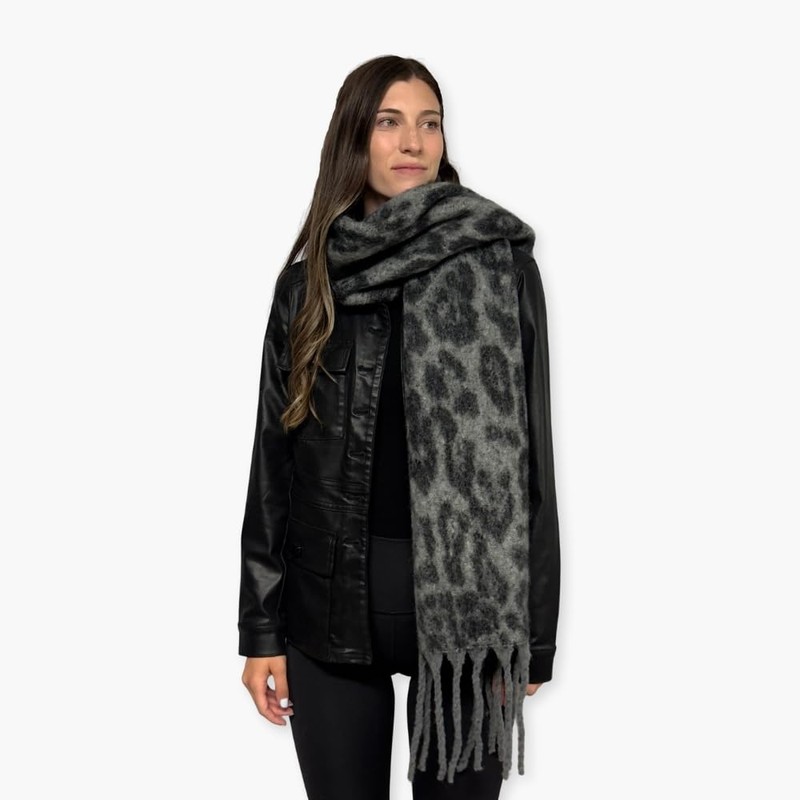 Humble Hilo Woven Chunky Scarf Cocoon with Fringe (Grey Leopard Print) - Oversized cold weather Neck Scarf, Ladies & Mens Scarves Winter