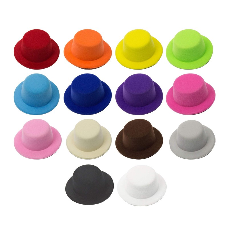 A 5" mini top hat base that is ready for decorating, or use as is. The crown measures 2" tall and it is covered with a felt style material. Two hair clips are attached to the base. These hat bases are great for many occasions and fun to decorate!