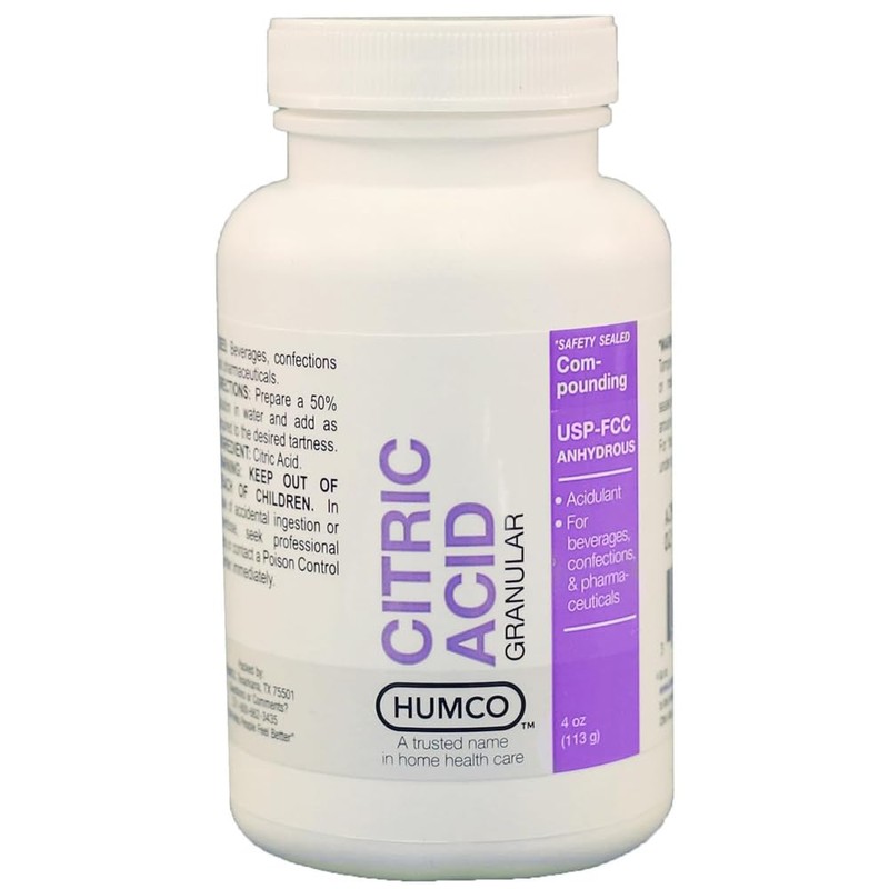 Citric Acid Granular 4 oz by Humco Holding Group. Made in the USA. Uses- Compounding, USP-FCC anhydrous, ACCIDULANT, FOR BEVERAGES, CONFECTIONS, & PHARMACEUTICLES. Because of its acidic, sour-tasting nature, citric acid is predominantly used as a flavoring and preserving agent — especially in soft drinks and candies. It's also used to stabilize or preserve medicines and as a disinfectant against viruses and bacteria.