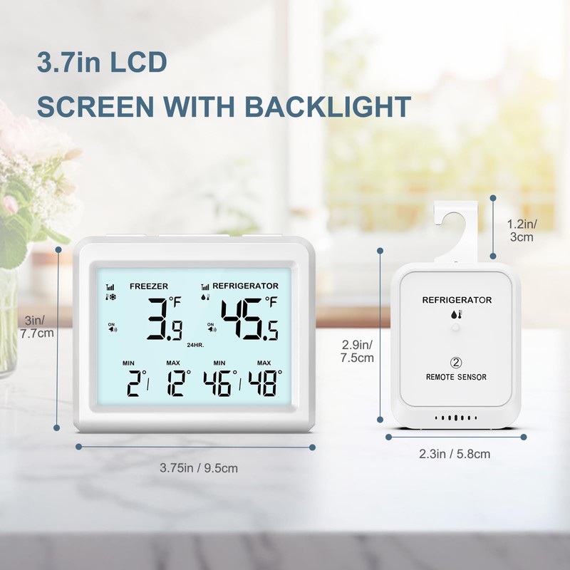 • 【2 alarm modes】: refrigerator thermometer support 2 transmitter positions for upper and lower limit alarm function, 2 alarm modes (symbol flashing + sound), when alarming, the current temperature number, MAX/MIN symbol and alarm symbol will flash together, the alarm sound will be kept for 2 minutes.